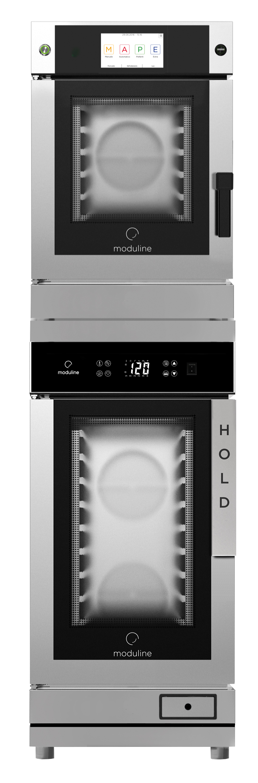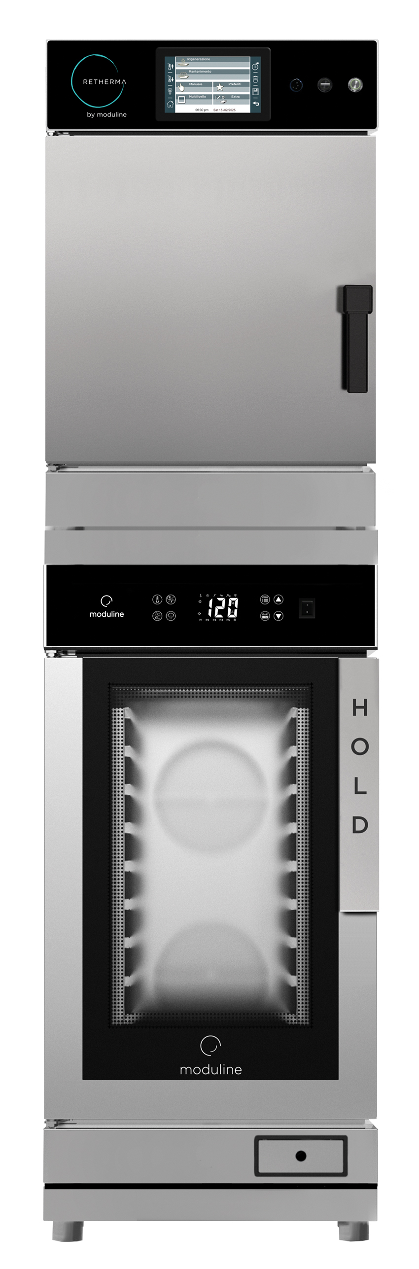 - Digitalanzeige, Hauptschalter, Taste für Start / Stopp, Vorheiz-, Warmhalte- und Abkühlfunktion, Warmhalten über Standardprogramm oder Kerntemperaturfühler, Regeneration zeitgesteuert oder über Kerntemperaturfühler, CLIMACHEF-System, automatische Kontrolle der Luftfeuchtigkeit, Speicher- und Abruffunktion für Programme, Wertanpassung über Auf-/Ab-Tasten, akustisches Signal am Ende des Zyklus, manuelle Tastensperre, WLAN-Schnittstelle (optional)