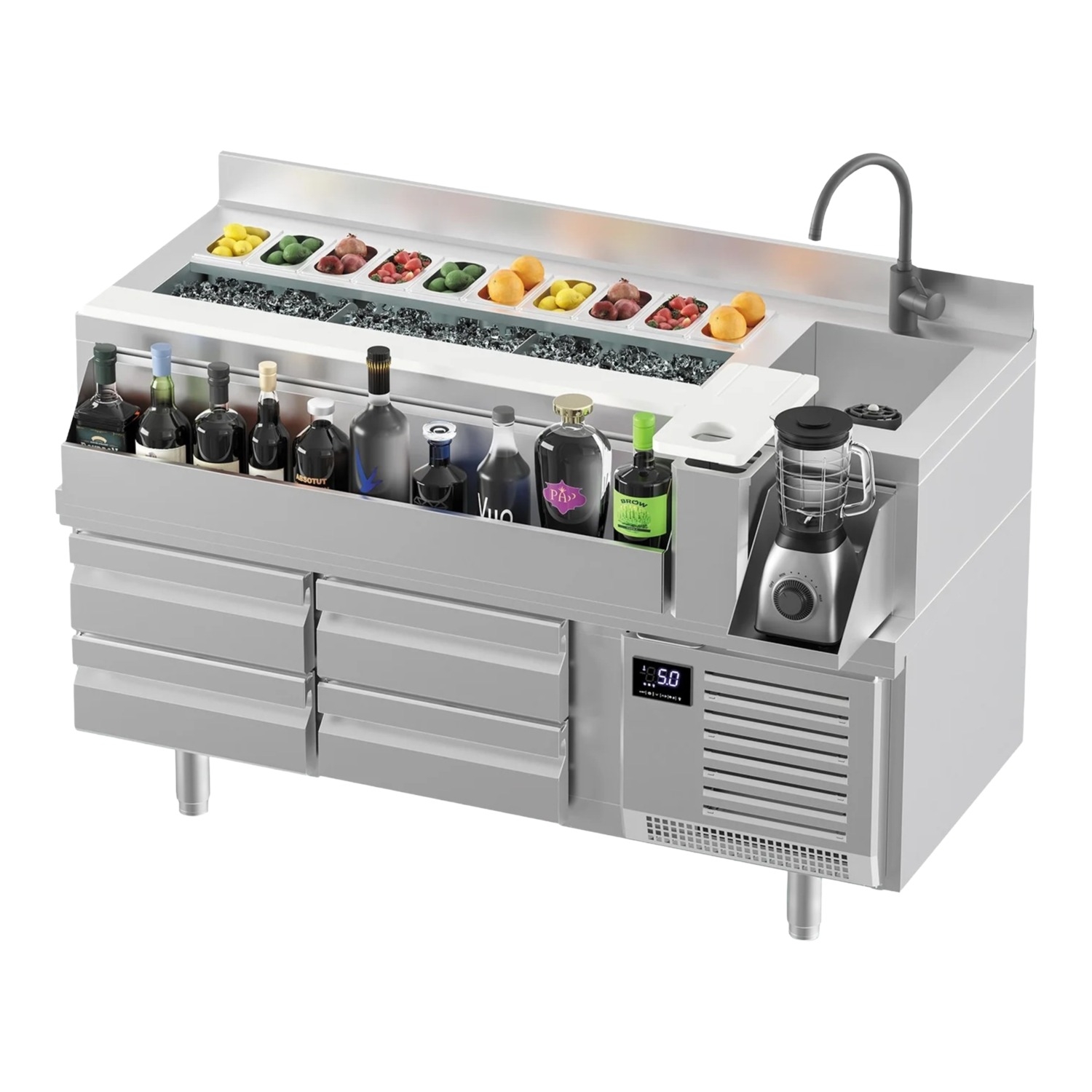 - Zone du bac à ingrédients, réfrigérée, bac à glace intégré, Évier avec robinet pour le nettoyage des outils de bar, Lave-verres intégré